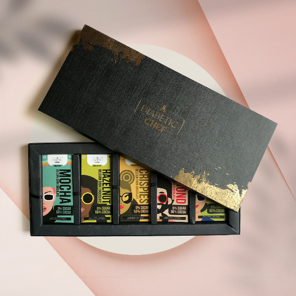 Description: A Diabetic Chef's Festive Gifting Box of 5 offers an exquisite selection of sugar-free dark chocolates in assorted flavors: Hazelnut, Cranberry, Almond, Crispies, and Mocha. Perfectly suited for diabetics and vegans, these chocolates are sweetened with stevia and maltitol and infused with bourbon vanilla extracts for a rich, indulgent taste. Beautifully packaged for festive gifting, this box is an ideal way to share the joy of healthy indulgence with friends and family.