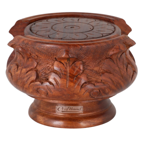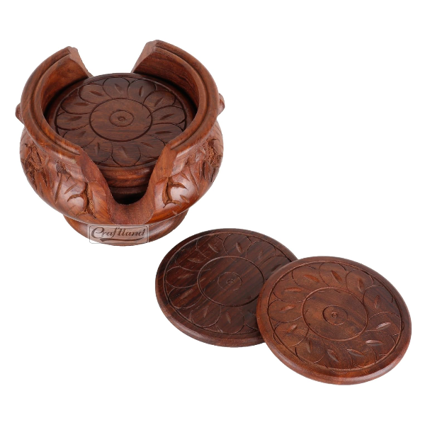 Craftland's Wooden Handmade Carved Set of 6 with Decorative Holder Tabletop Coasters for Tea Coffee Cups Mugs Beer Cans Bar Glass Indian Handicrafts | SustainGo