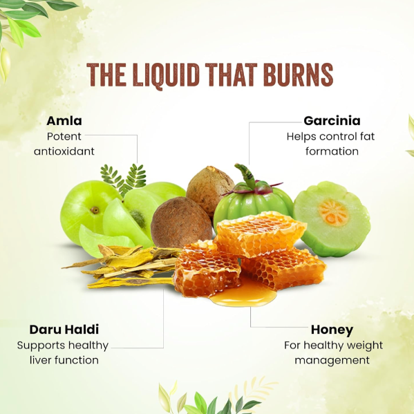 • Key Ingredients: Formulated with potent ingredients like Amla, Garcinia, Honey, and Daru Haldi, known for their weight management properties and health benefits.