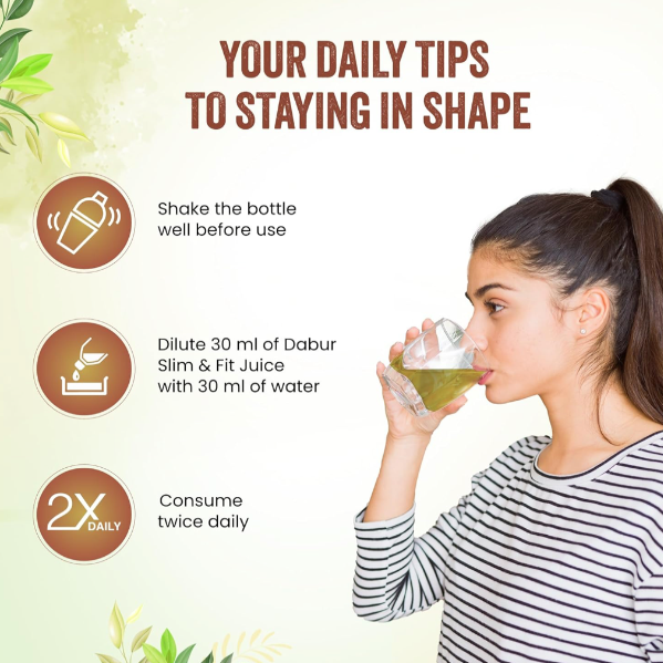• Healthy Weight Management: Dabur's Slim & Fit Juice is a natural and ayurvedic solution crafted to support healthy weight management and overall well-being.