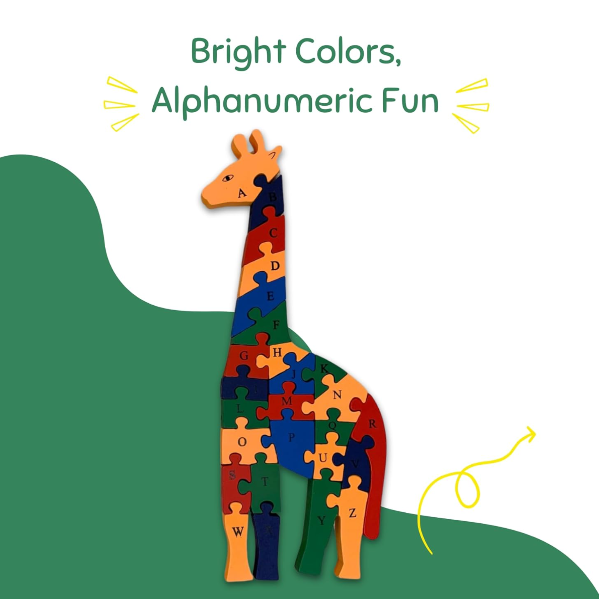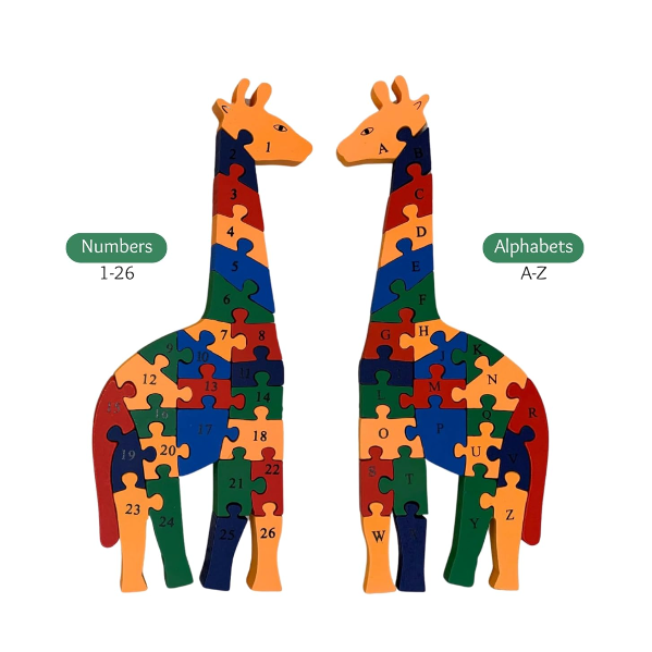 Earthy Tweens's Wooden Giraffe Puzzle Toy | Jigsaw Toy for Toddlers (2yrs+) | Eco-Friendly Colours & Materials | Sustainable & Non-Toxic |Develops memory, problem solving & execution skills | Educational - 26 Alpha-Numeric Pieces | 40 x 15 cm
