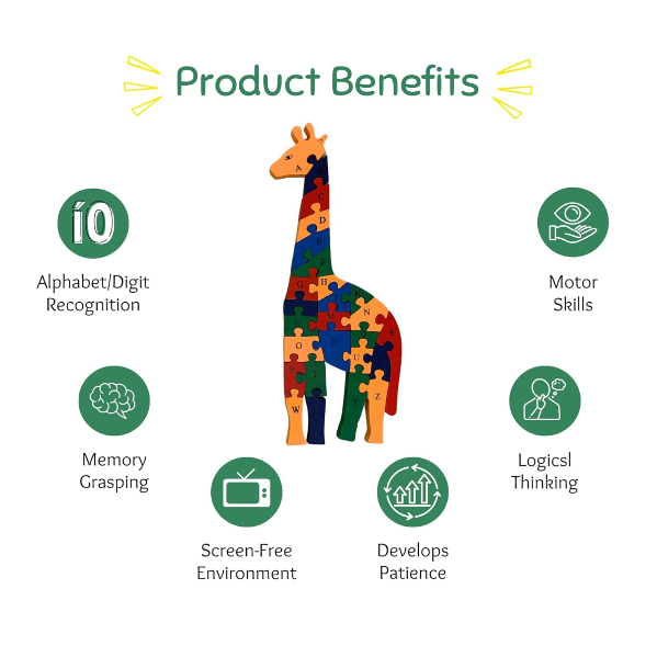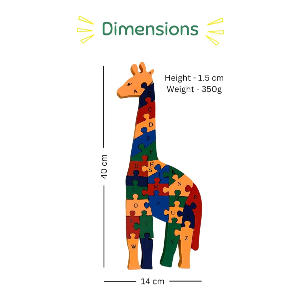 Description: Introduce your toddler to the joys of learning with Earthy Tweens's Wooden Giraffe Puzzle Toy. This eco-friendly jigsaw toy is crafted from sustainable materials and finished with non-toxic paints, ensuring a safe and healthy playtime for your little one. Designed for children aged 2 years and older, this educational toy features 26 alpha-numeric pieces that help develop memory, problem solving, and execution skills. The vibrant giraffe design is engaging and visually stimulating, making learning fun and interactive. Measuring 40 x 15 cm, this durable and safe puzzle toy is perfect for early childhood development.
