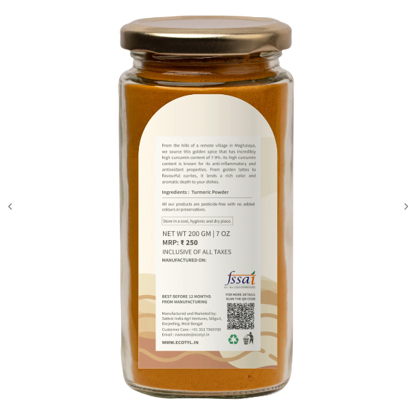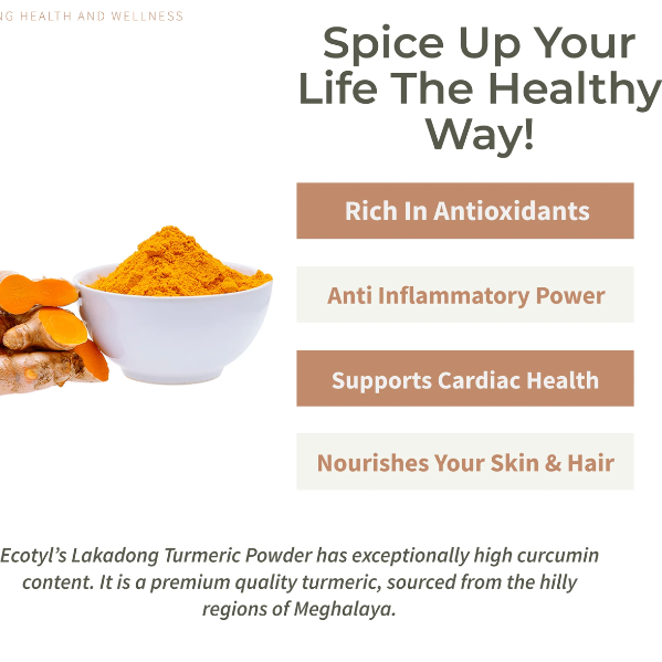 • High Curcumin Content: Ecotyl's Lakadong Turmeric Powder boasts a high curcumin content, offering potent anti-inflammatory and antioxidant properties.