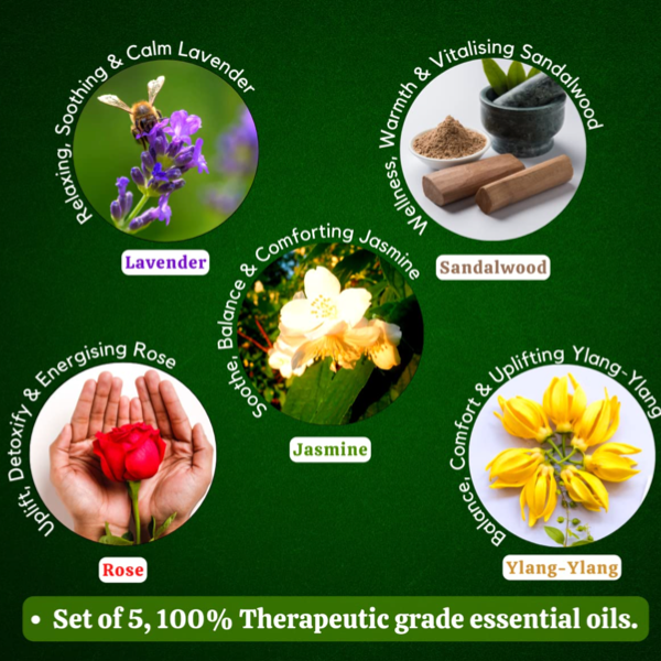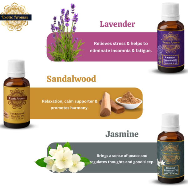 Exotic Aromas Pure Essential Oil | Lavender Oil, Sandalwood Oil, Jasmine Oil, Rose Oil, Ylang Ylang Oil | Set of 5 | 15 ml each | Natural beauty with SustainGo