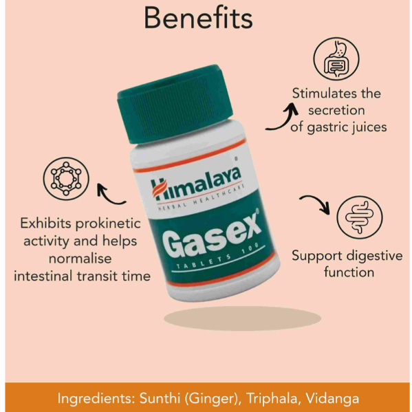 Himalaya's Gasex Tablets | Digestive Wellness | Improves Digestion & Gaseous Distention | Sunthi (Ginger), Triphala, Vidanga etc.. |100 Tablets