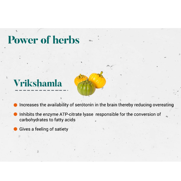 • Reduces Overeating: Enriched with Vrikshamla extract, this herbal supplement helps reduce overeating by promoting a feeling of fullness and satisfaction.