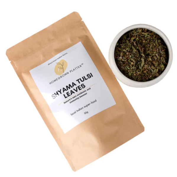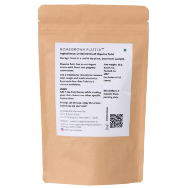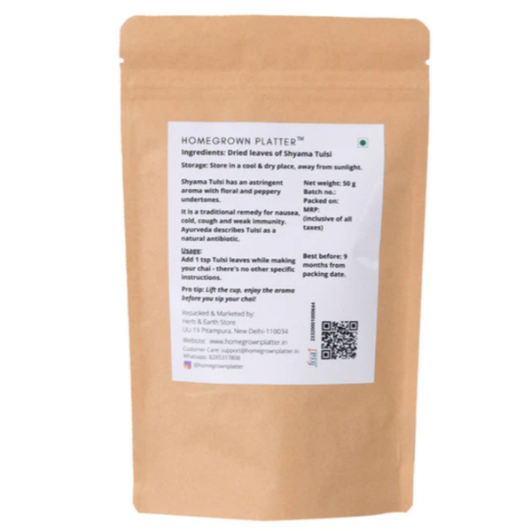 • Brewing Instructions: Add a teaspoon of Homegrown Platter's Dried Shyama Tulsi Leaves to your boiling water while preparing masala chai. Let it steep for 5-7 minutes to release its full flavor and benefits.