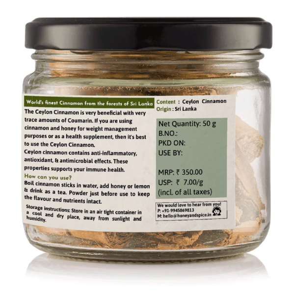 Description: Honey & Spice's Ceylon Cinnamon Sticks are a premium spice sourced from the pristine forests of Sri Lanka. Known for its unique flavor and numerous health benefits, Ceylon cinnamon is a powerful anti-inflammatory, antioxidant, and antimicrobial agent. It aids in weight loss, boosts immunity, and supports overall health. Our 50g pack of Ceylon cinnamon sticks is perfect for adding a touch of natural goodness to your culinary creations and wellness routines.