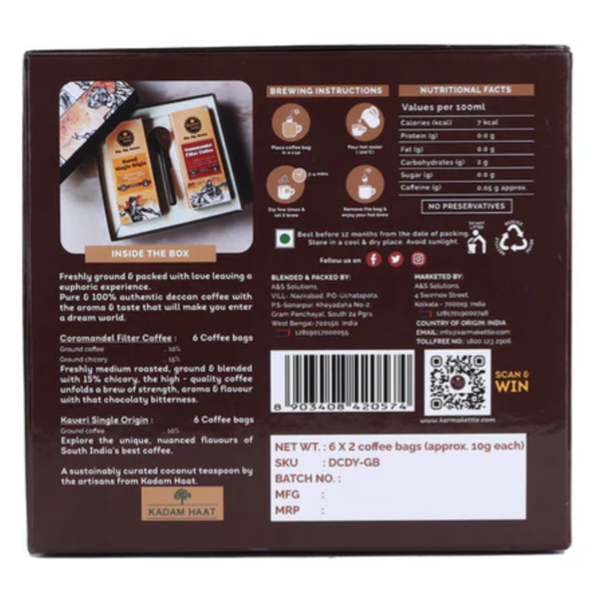 Karma Kettle's Coffee Gift Box | South Indian Filter Coffee & Single Origin experience | 6 Coromandel Filter Coffee bags - medium roasted ground coffee, Chicory, Chocolate, Nuts | 6 KaverI Single Origin bags-100% Arabica | 12 Coffee Bags