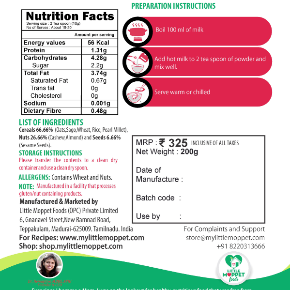 Description: Little Moppet Foods's Lacto Booster is a carefully crafted blend of natural ingredients designed to support lactation in breastfeeding mothers. Made with oats, sago, wheat dalia, brown rice, pearl millet, cashews, and almonds, this fine powder provides essential nutrients without any preservatives, artificial flavors, or colors. The easy-to-mix formula allows you to incorporate it into your daily diet effortlessly. Packaged in ecofriendly brown kraft paper, this product is as kind to the environment as it is to you. With 200 grams of nutrient-rich goodness, Little Moppet Foods's Lacto Booster ensures that you and your baby get the best nature has to offer.
