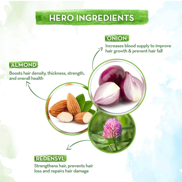 1. Hair Fall Control: Formulated with onion and Redensyl to effectively reduce hair fall and promote hair regrowth.