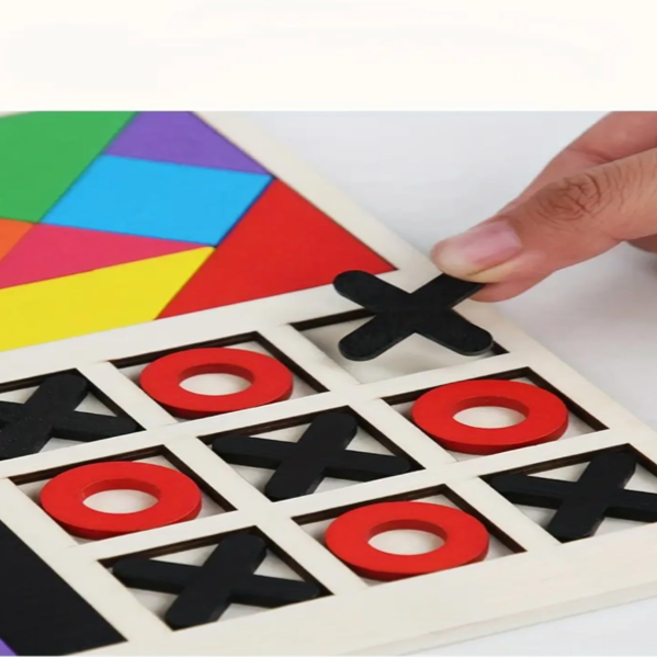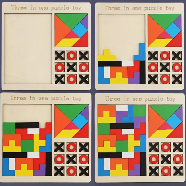 • 3 in 1 Educational Puzzle: Combines three classic games in one set: Square Tangram, Tic-tac-Toe, and Building Blocks, offering diverse play options.