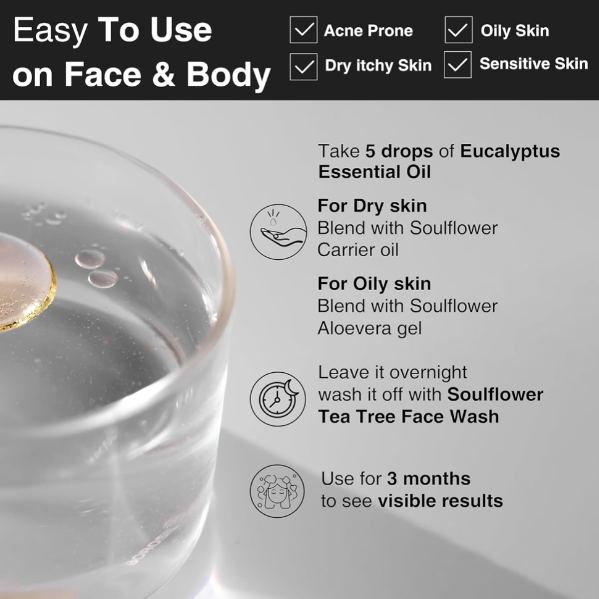 • For Skin Care: Dilute eucalyptus oil with a carrier oil and apply to skin irritations for soothing relief.