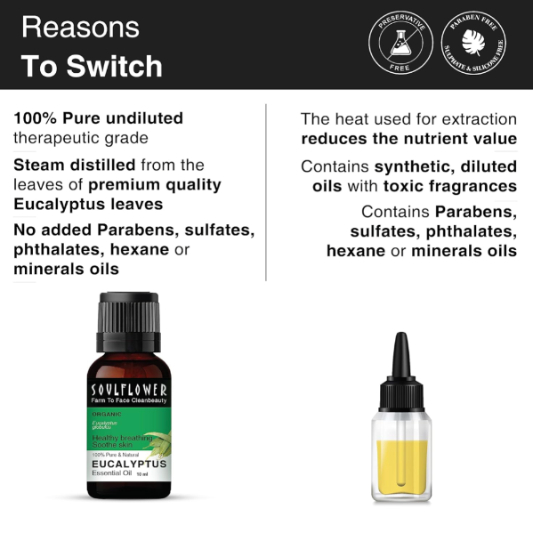 Description: Soulflower's Pure Eucalyptus Essential Oil is a versatile and invigorating elixir derived from the pristine Nilgiri Eucalyptus Globulus. This premium quality oil offers a multitude of benefits for hair, skin, and overall well-being. When used for hair care, it stimulates hair follicles and improves blood circulation in the scalp, promoting healthy hair growth. For respiratory health, steam inhalation with eucalyptus oil clears congestion and facilitates easy breathing. Its aromatherapy benefits uplift the mood, energize the mind, and promote mental clarity. Additionally, eucalyptus oil's antiseptic and anti-inflammatory properties soothe skin irritations and promote skin health. In massages or baths, it relieves muscle tension and soreness, promoting relaxation and rejuvenation. Soulflower presents a premium essential oil that revitalizes your senses and enhances your holistic wellness journey.