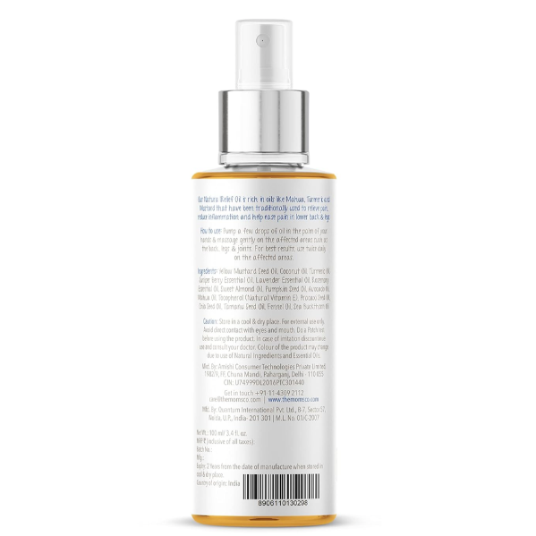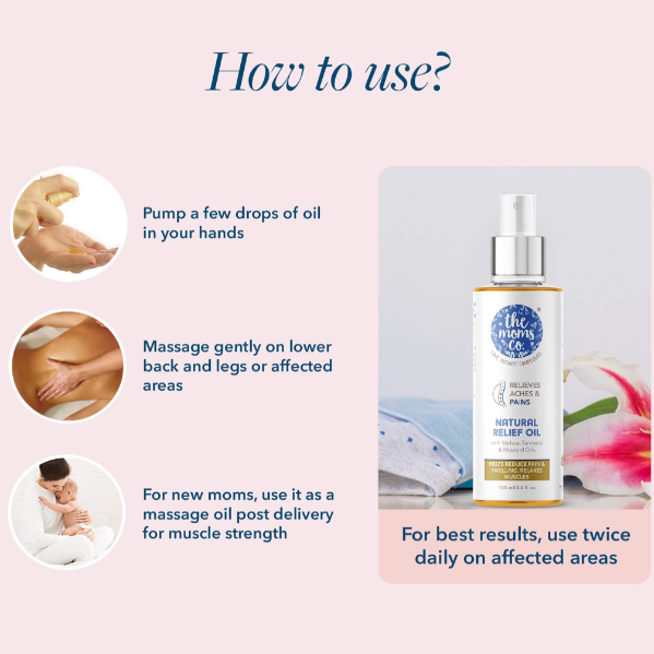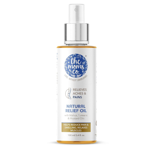 Description: The Moms Co. Natural Pain Relief Massage Oil is designed to provide effective and natural relief from various types of pain, including back pain, knee pain, muscle aches, menstrual cramps, and discomfort during postpartum recovery. Infused with the goodness of Mahua oil, turmeric oil, and mustard oil, this massage oil offers anti-inflammatory, antioxidant, and circulation-boosting benefits. Free from harmful chemicals, it is safe and suitable for everyday use. Whether you're dealing with everyday aches or recovering from childbirth, this 100ml bottle of natural relief is perfect for soothing your discomfort.