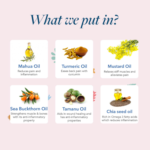 • Mahua Oil: Known for its anti-inflammatory properties, it helps soothe and relieve pain.