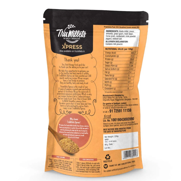 • Instant Mix: Enjoy the convenience of Trumillets's Xpress Badam Milk, an easy-to-make instant mix that combines the goodness of millets, almonds, and cardamom.