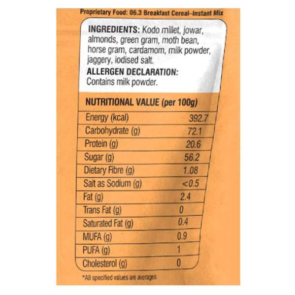 • Healthy Ingredients: Made with wholesome ingredients such as Kodo millet, jowar, almonds, cardamom, and jaggery, providing a delicious and nutritious beverage.