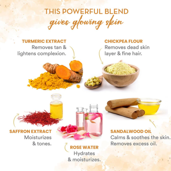 1. Turmeric & Saffron: Enriched with the goodness of turmeric and saffron to brighten and even out skin tone.